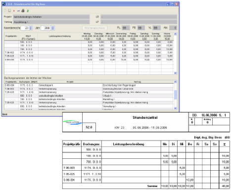 Die Arbeitszeiten einer Woche werden von den Mitarbeitern in Stundenzetteln wöchentlich erfasst. Zu jeder Leistungsphase kann der Mitarbeiter eine Tätigkeitsbeschreibung hinzufügen. Bucht der Mitarbeiter die Arbeitszeiten mit dem Wochenabschluss sind diese für Ihn nicht mehr änderbar.